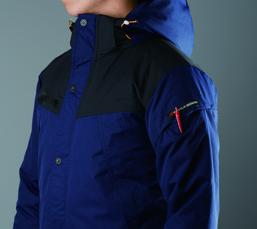 表地ナイロン100% 別布ナイロン100%中綿ポリエステル100%裏地ポリエステル100%表地ナイロンタスラン(耐久撥水加工)PUコーテング樹脂加工(耐水圧10000㎜透湿圧8000G㎡/24hrs)裏地全天候型保温素材「サーモトロン ラジポカ」帯電防止ニットアルミフィルムラミネート加工(保温性)